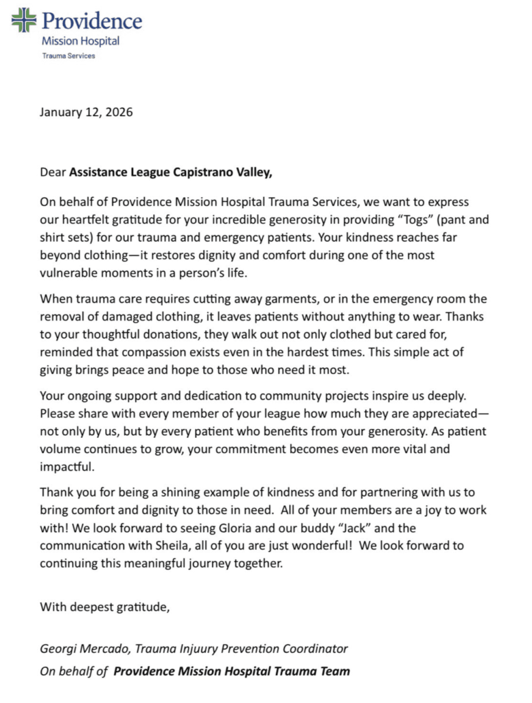 In times of crisis, it’s essential to provide comfort and dignity. Our Trauma Togs program provides clothing for emergency room patients who have unexpectedly found themselves in distressing situations, often having their clothes cut off due to medical emergencies. This program serves Providence Mission Hospital emergency rooms located in Laguna Beach and Mission Viejo. This initiative serves to ensure that all patients receive the compassionate care they deserve while also maintaining their modesty during hospital visits.